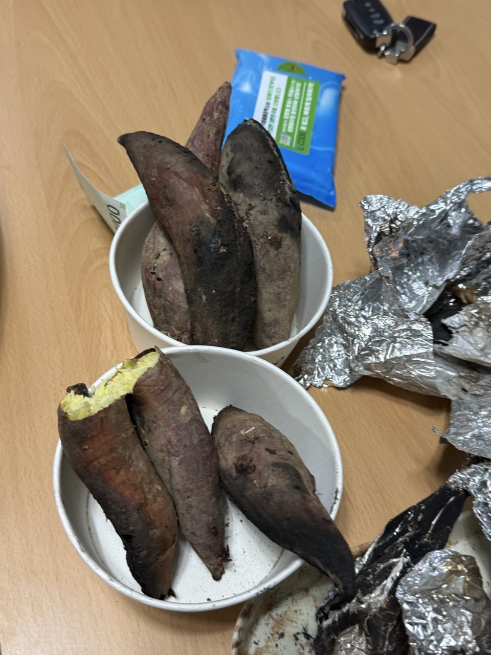 밖에서는 숯불 피우고 차가운 겨울 공기 속에서 감자와 고구마를 호일에 싸서 불가에 올렸습니다. 윷놀이 중간에 가지고 온 호일을 젖히자 고소한 냄새와 김이 피어올랐고 맛은 둘이 먹다 셋이 죽어도 모를 맛 왜 셋? 이웃에서 놀러와 같이 죽음. 과메기는 파와 초장, 그리고 생미역에 싸서 싱싱함과 함께 먹었고, 해물라면이 등장하자 모두가 한 젖가락을 들었습니다. 과일, 닭강정, 뜨끈한 오뎅 국물도 속을 든든히 채워 줬습니다.